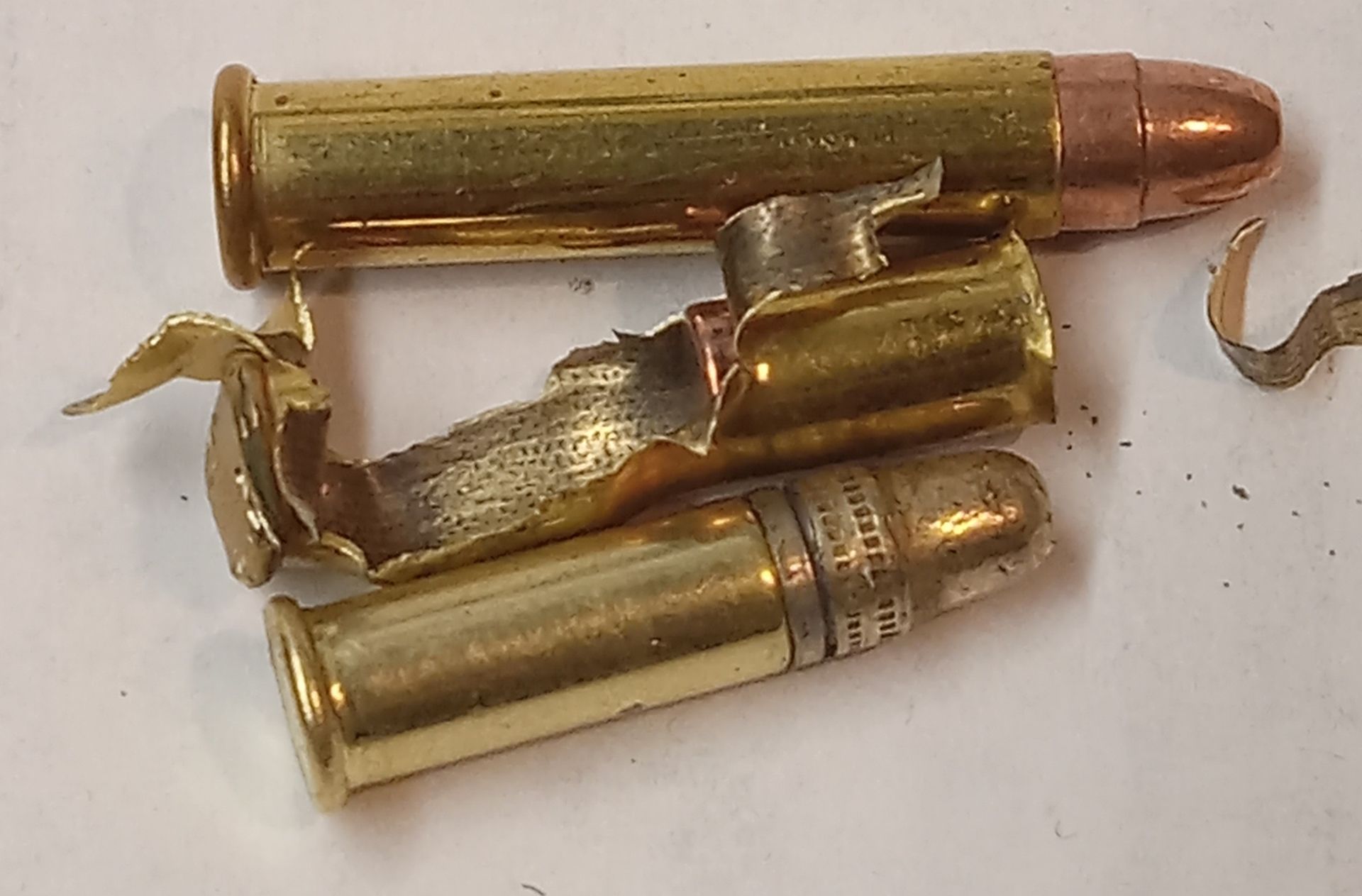 The expoded brass is 22 WMG which was jammed in a curved 22 LR feed tube. Pushed from the bullet end, it blew out just before it cleared the passage. No injuries.